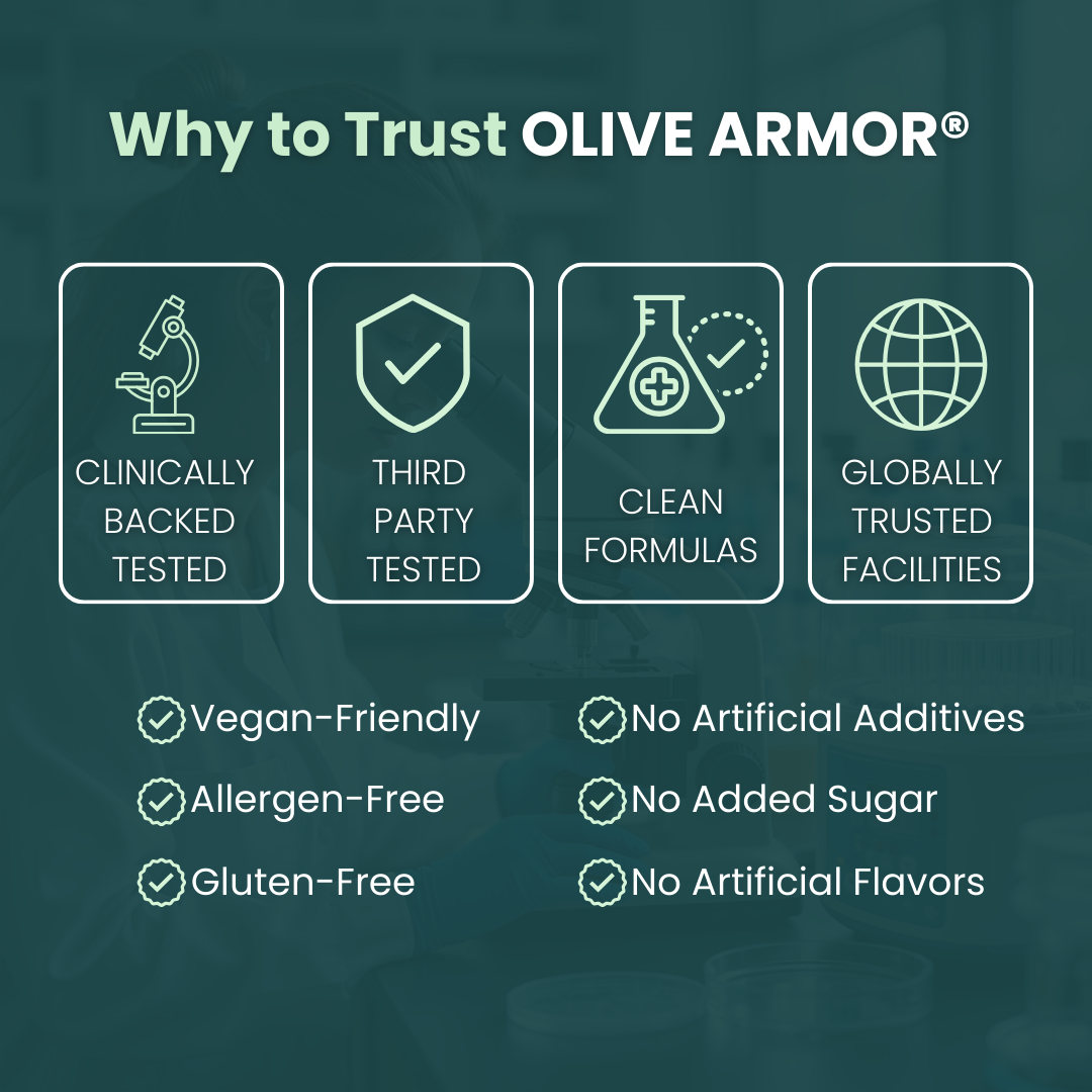 If you're exhausted from getting sick more often as you age, tired of antibiotics that stop working, or done with immune supplements that don't deliver — Olive Armor® was made for you and your family.This daily formula helps you stay strong, protected, and resilient — so you stop missing work in your peak earning years, stop canceling travel plans you've been looking forward to, and finally enjoy time with grandkids without worrying about catching everything they bring. All powered by a 3,000-year-old Mediterranean secret now validated by modern science.